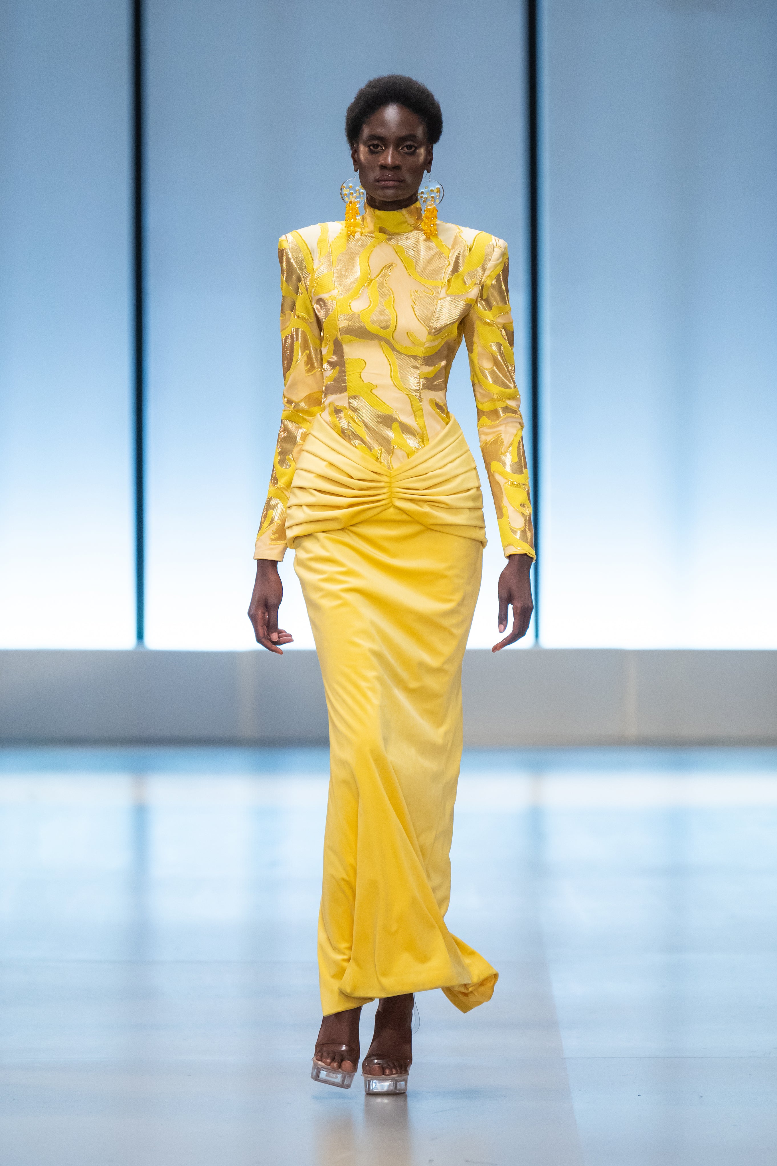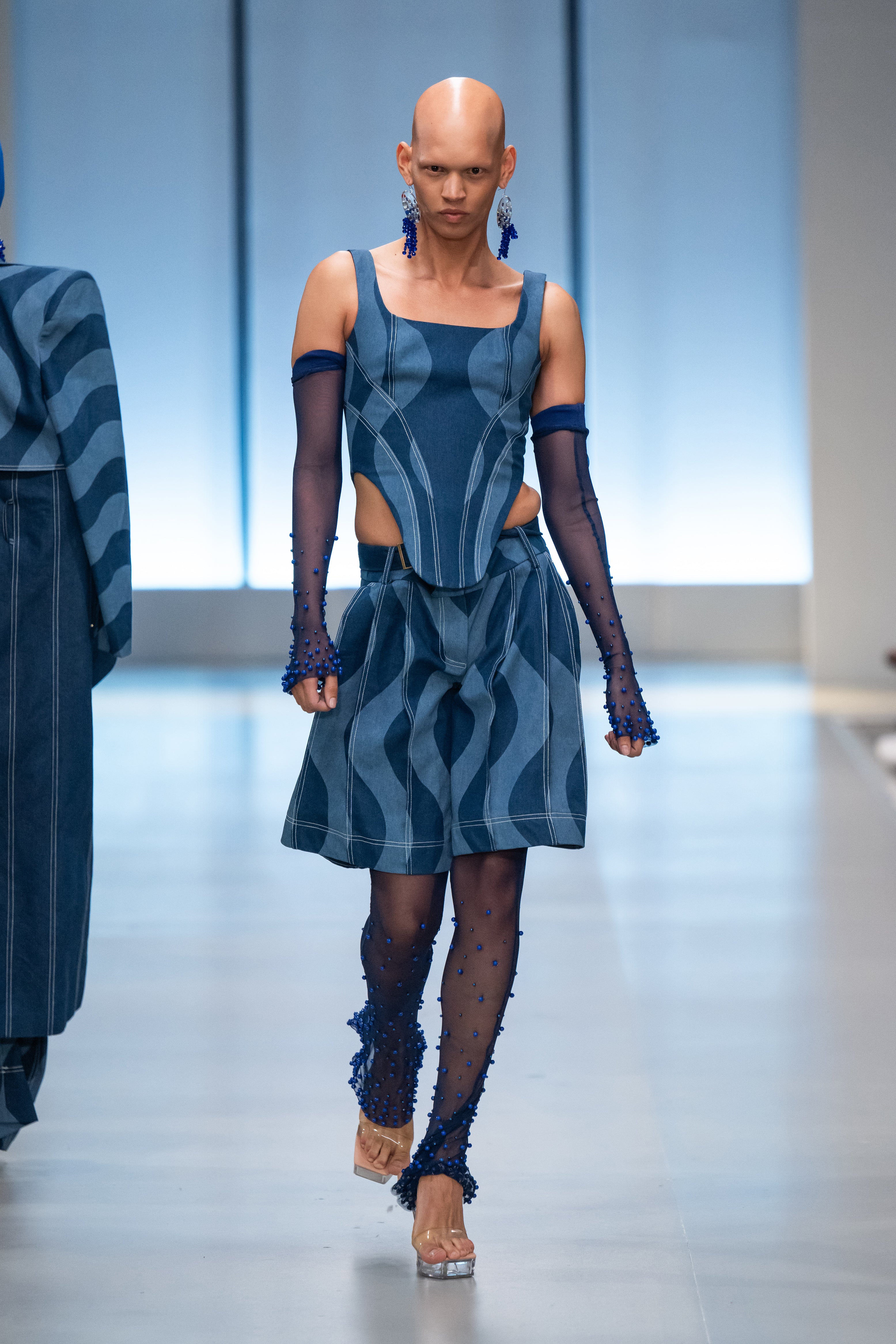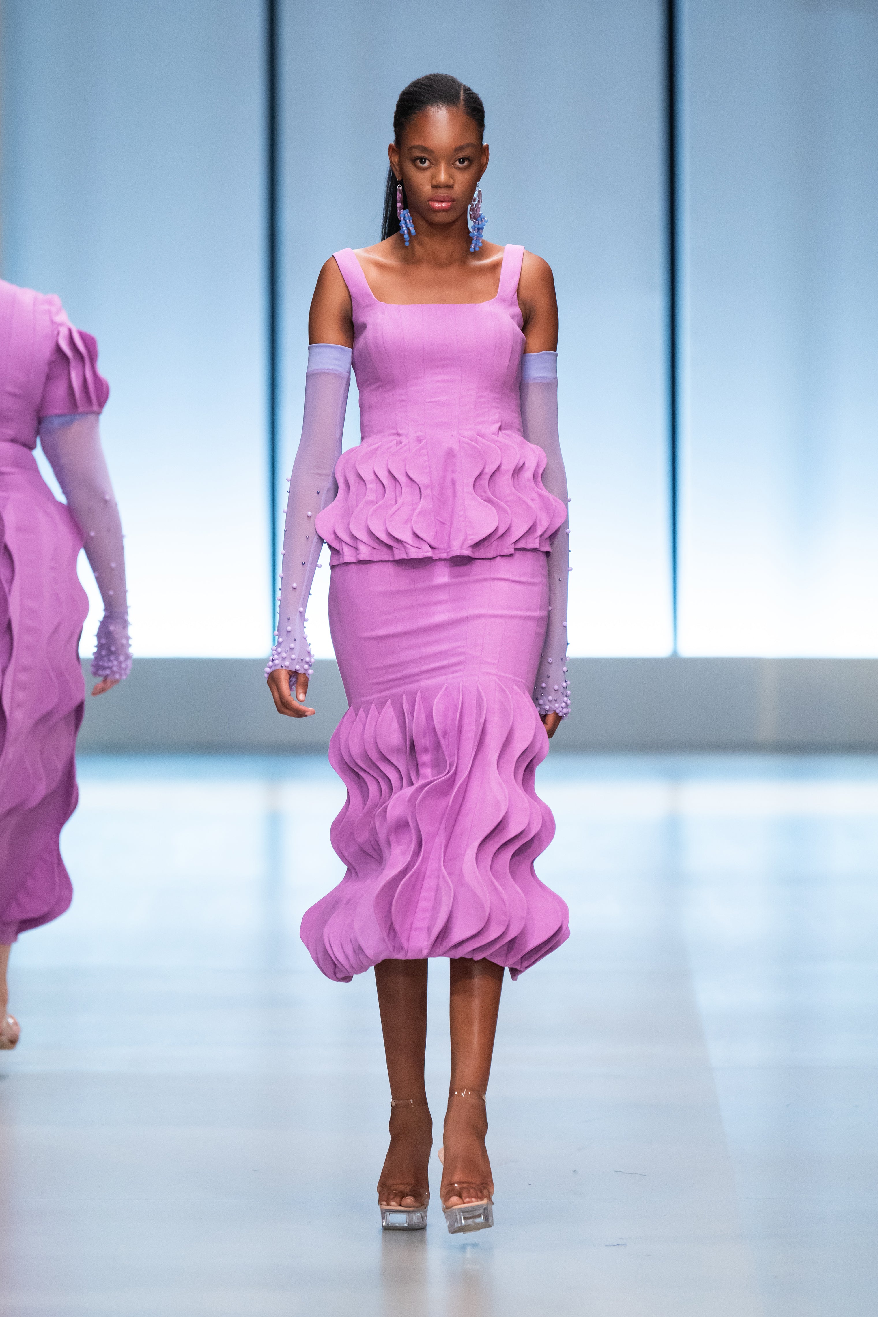 The collection takes its visual signifiers from the growth and development of the natural world around us as a metaphor for our individual evolution and relation to the environment and society surrounding us. It references the formation of natural rock and stone, precious minerals and ores, clouds, foliage, waves and wind to create a range of garments within which everyone can explore their complex and ever-changing individuality alongside a world just as complex in its constant growth and progression.