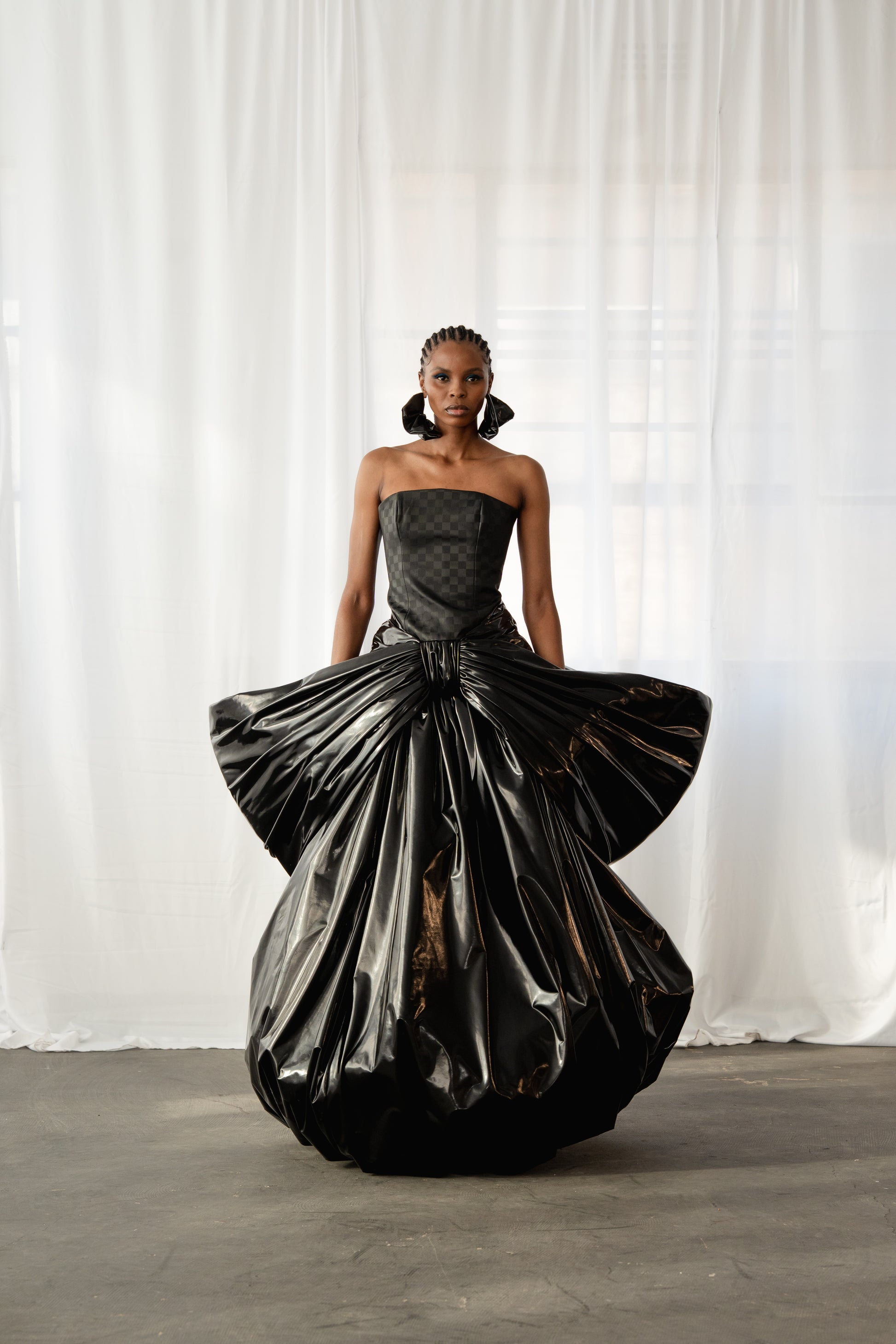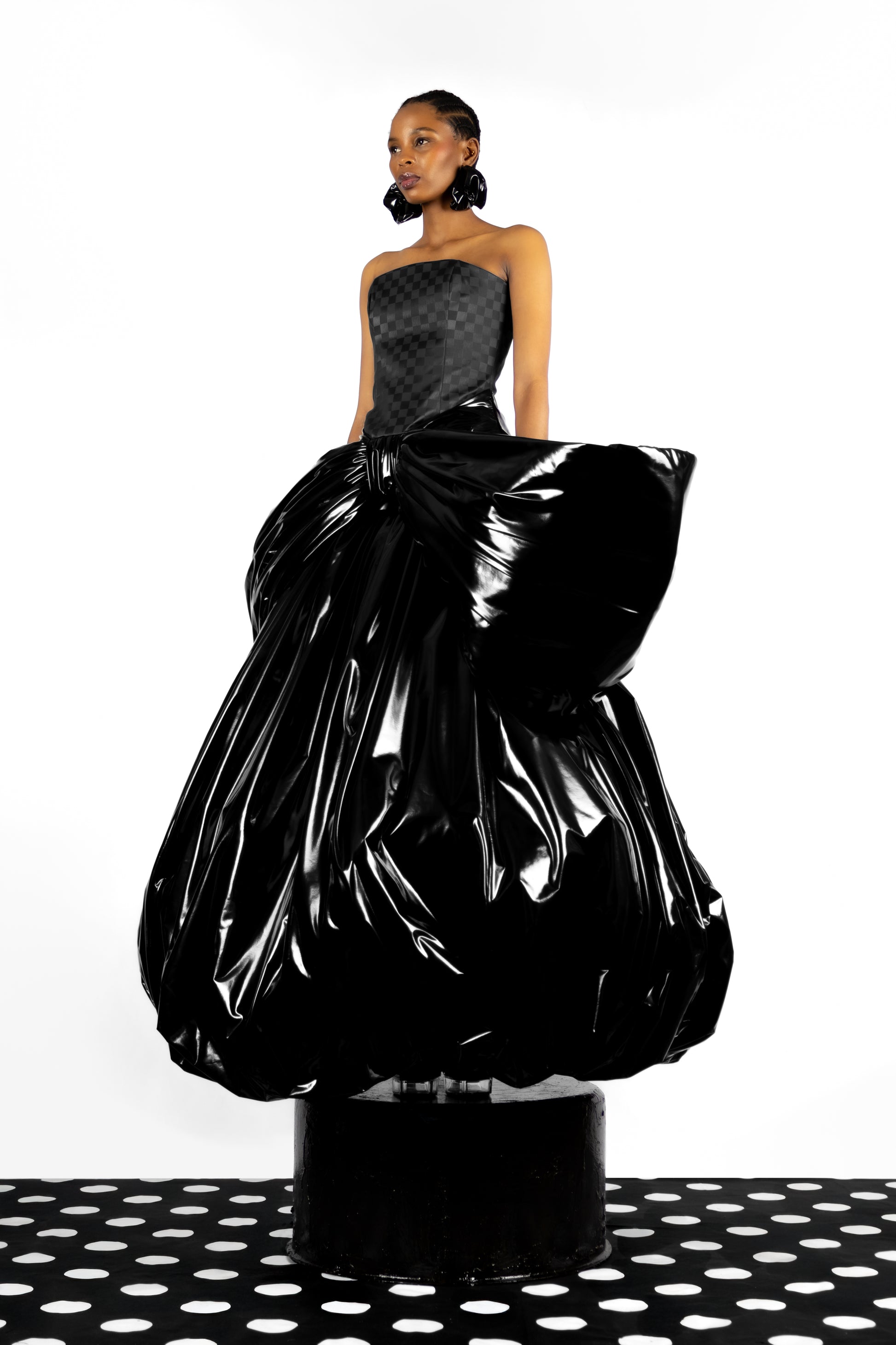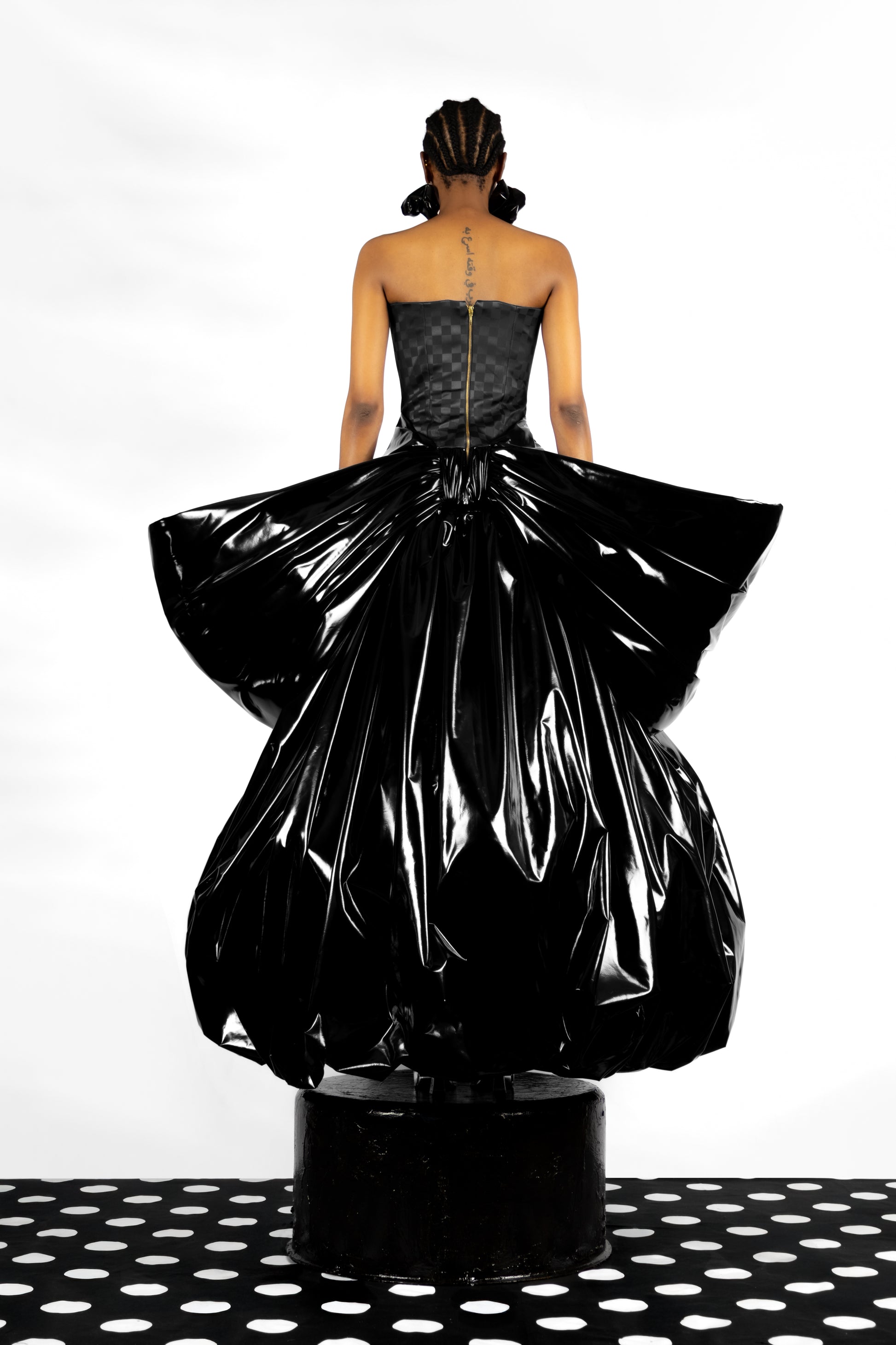 Introducing The Checkerboard Gown Set: The classic checkered print reimagined in a slick, futuristic rubber with statement glossy vinyl bows