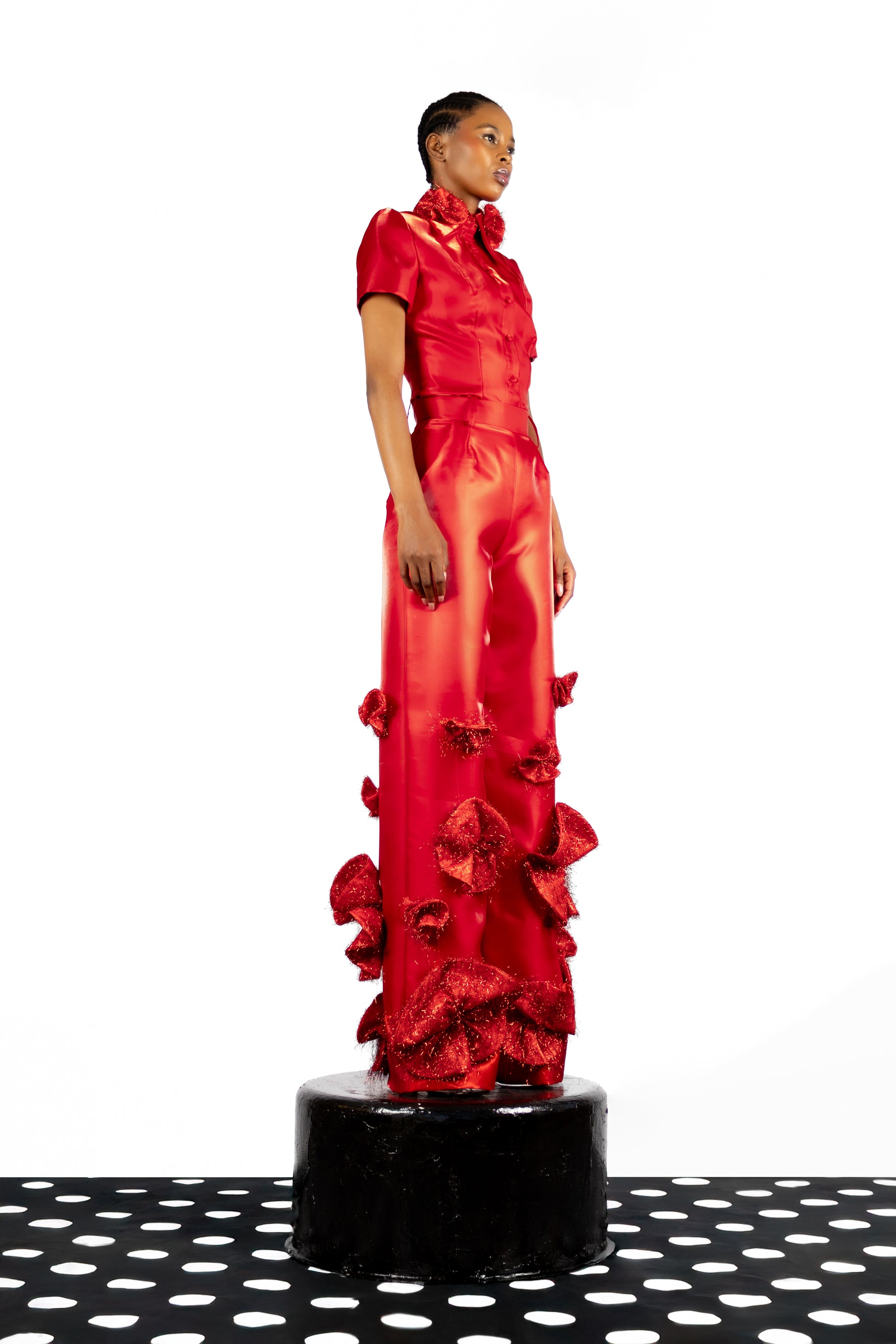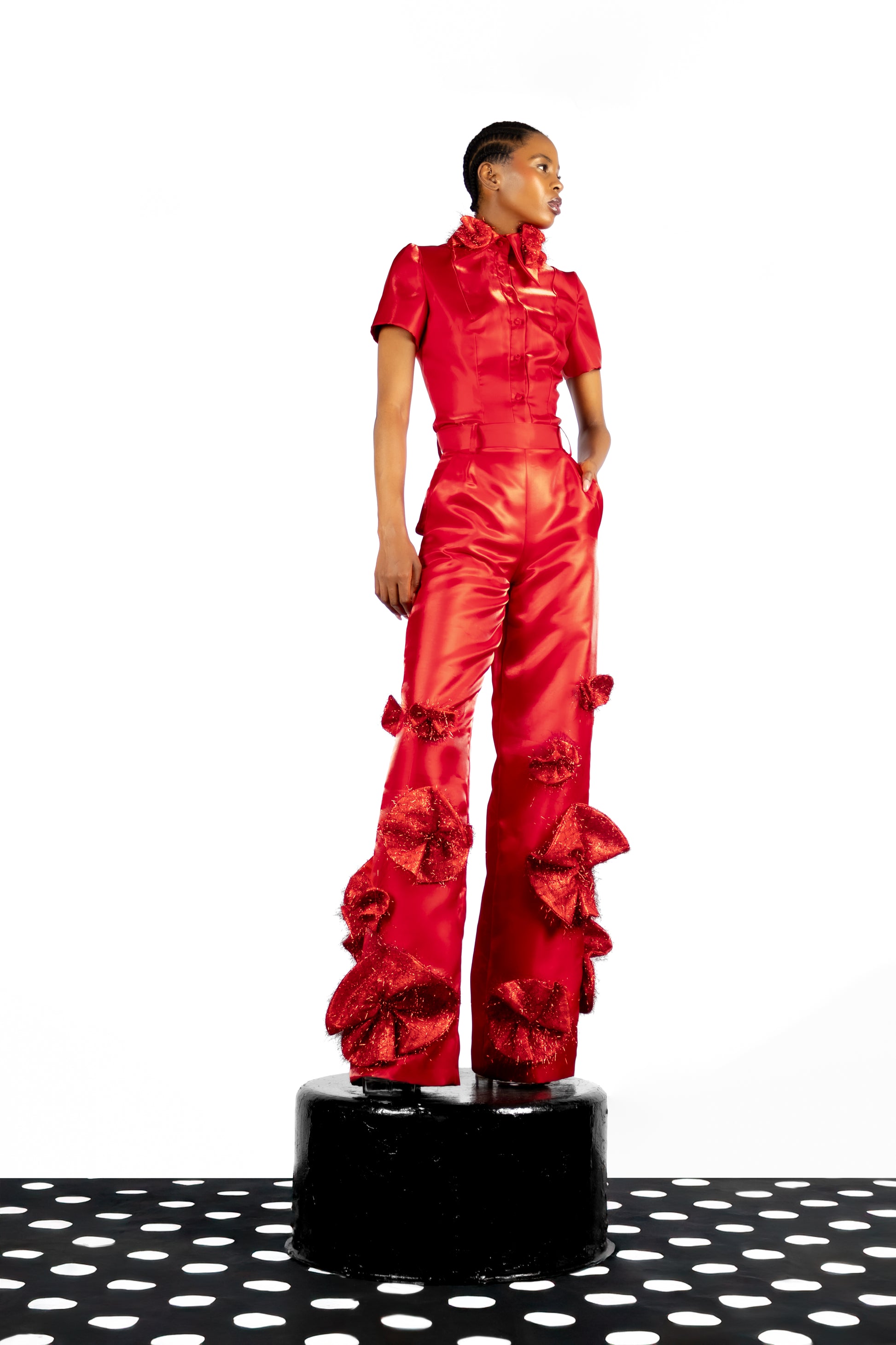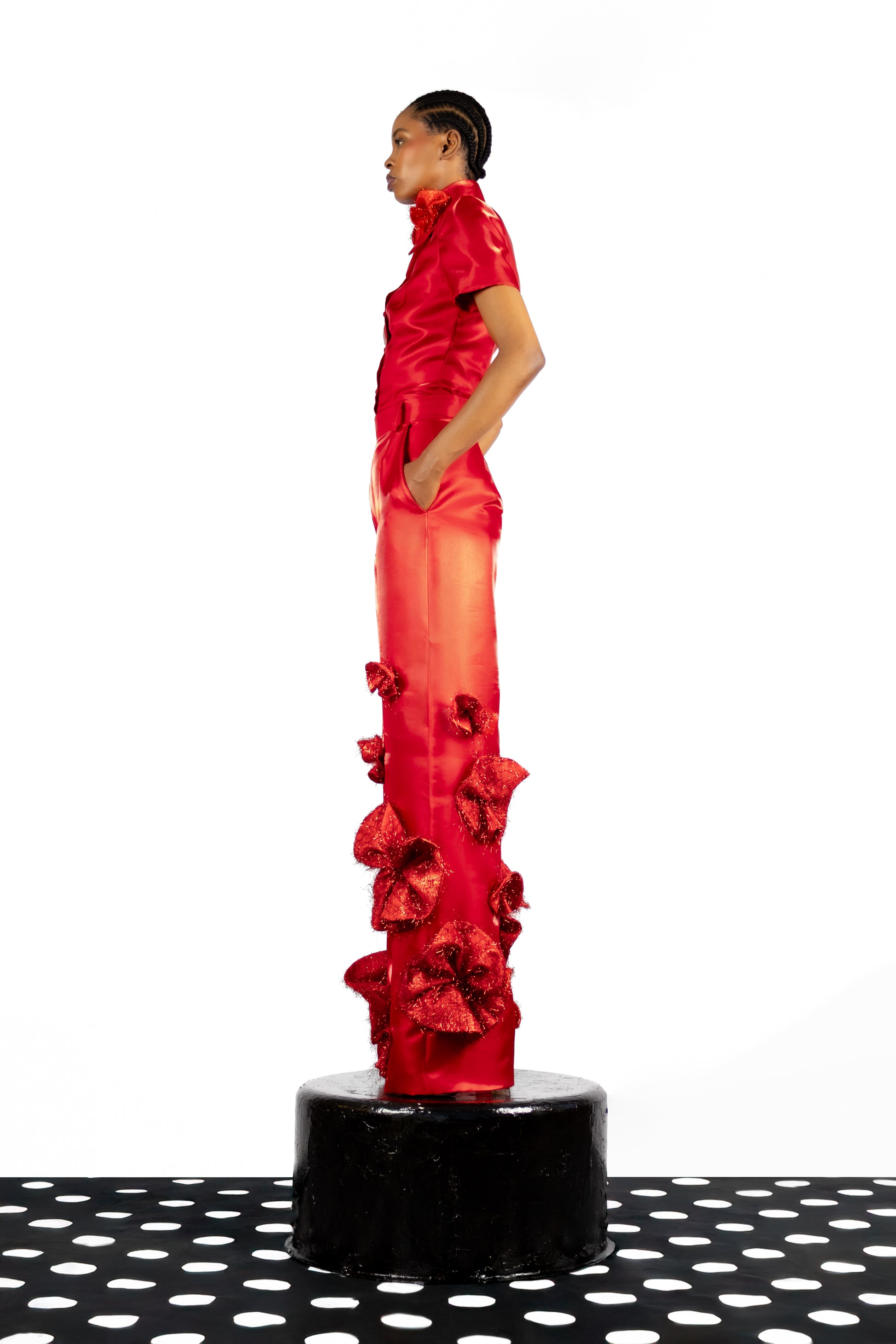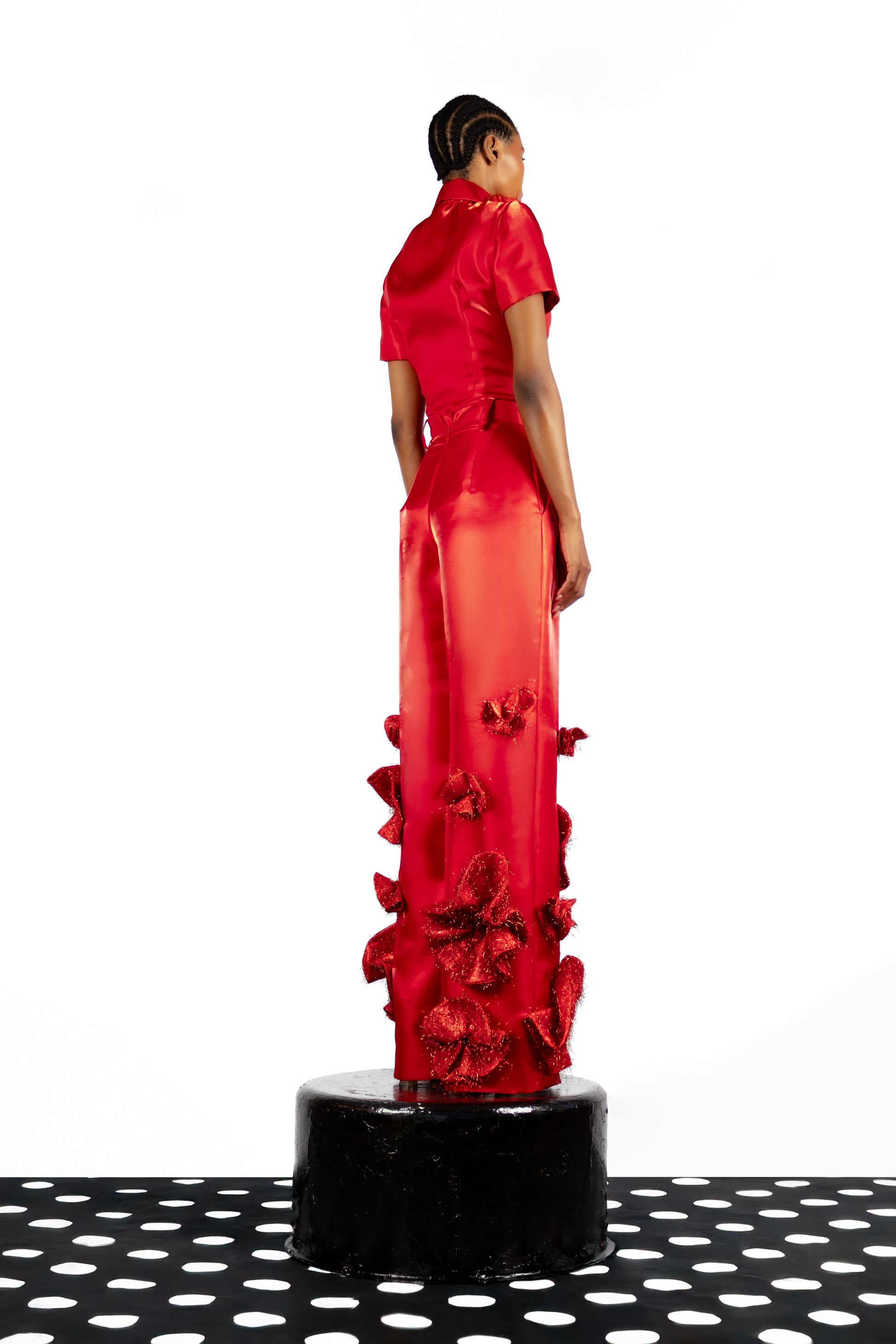 Introducing The Fleck Trousers: Summer trousers in liquid Mikado Satin, accented with glistening metallic fringe appliqués.