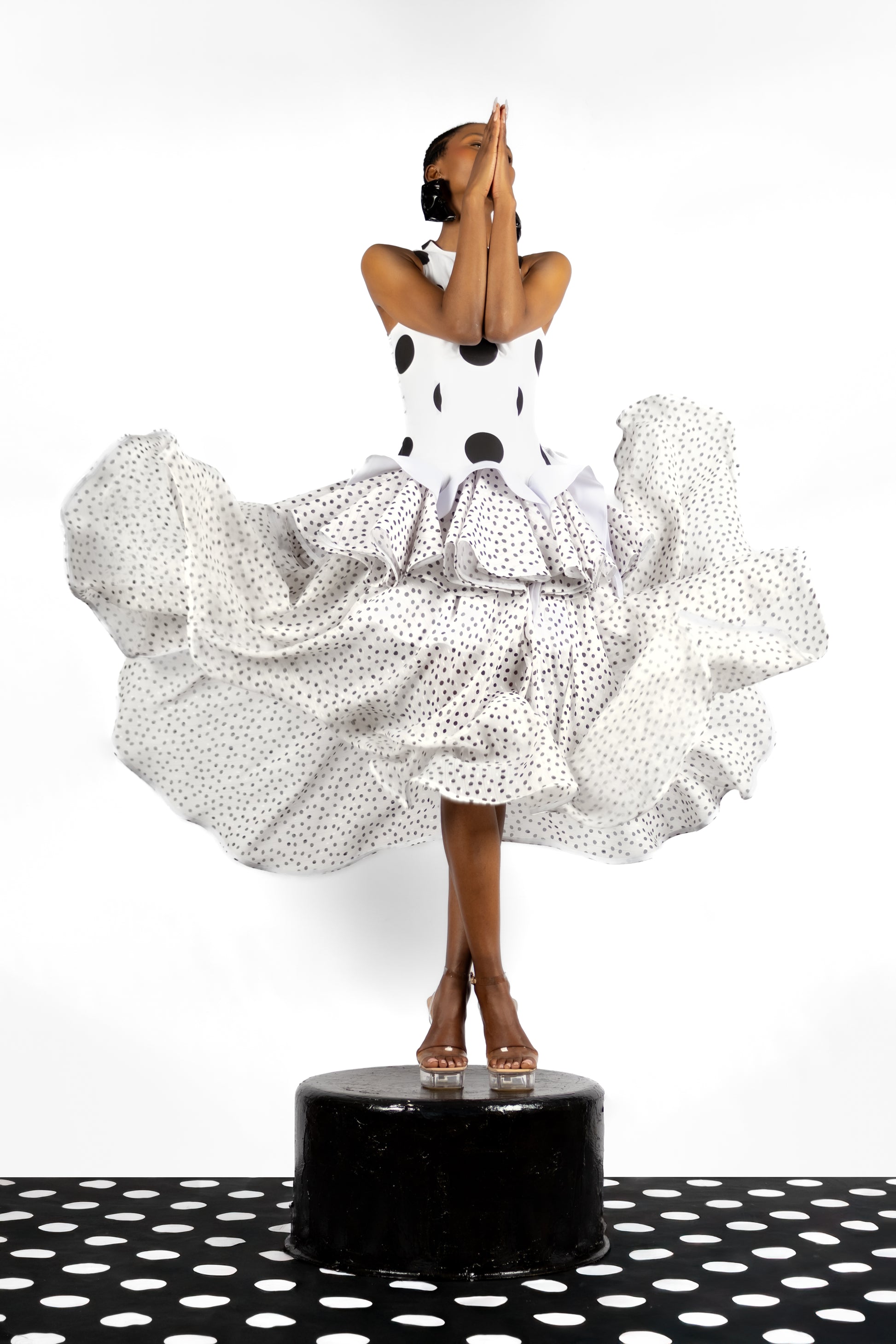 Introducing The Multi-Dotted Dress: A contemporary take on the classic oversized BAM polkadot, spliced with voluminous flounces.