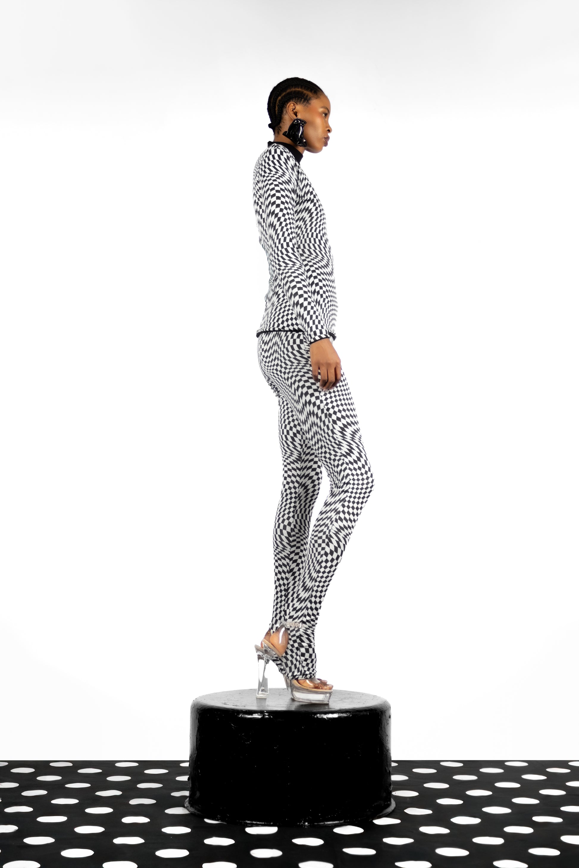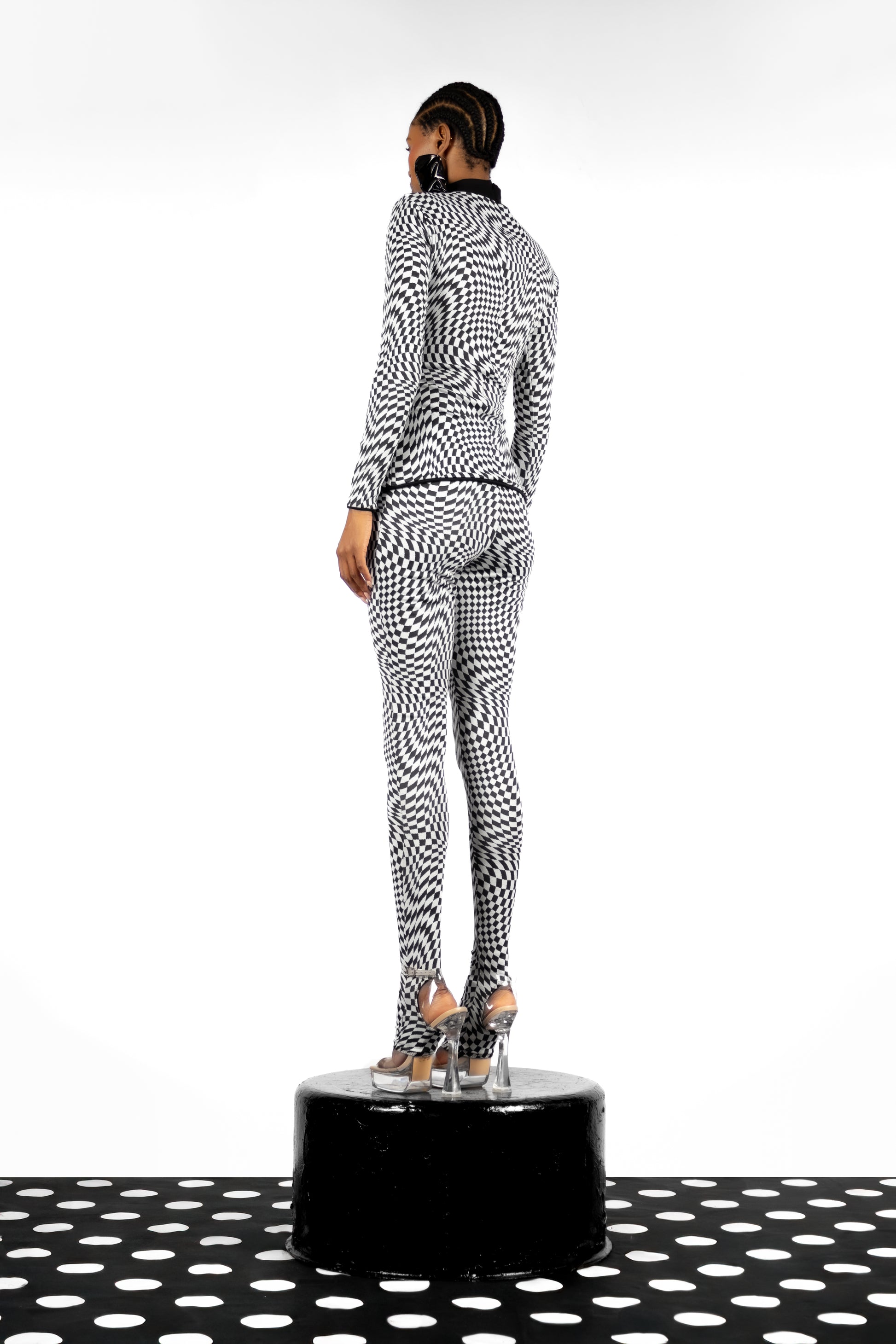 Introducing The Psychedelic Poloneck: A fitted polo neck top crafted from a bold optical illusion jacquard knit.