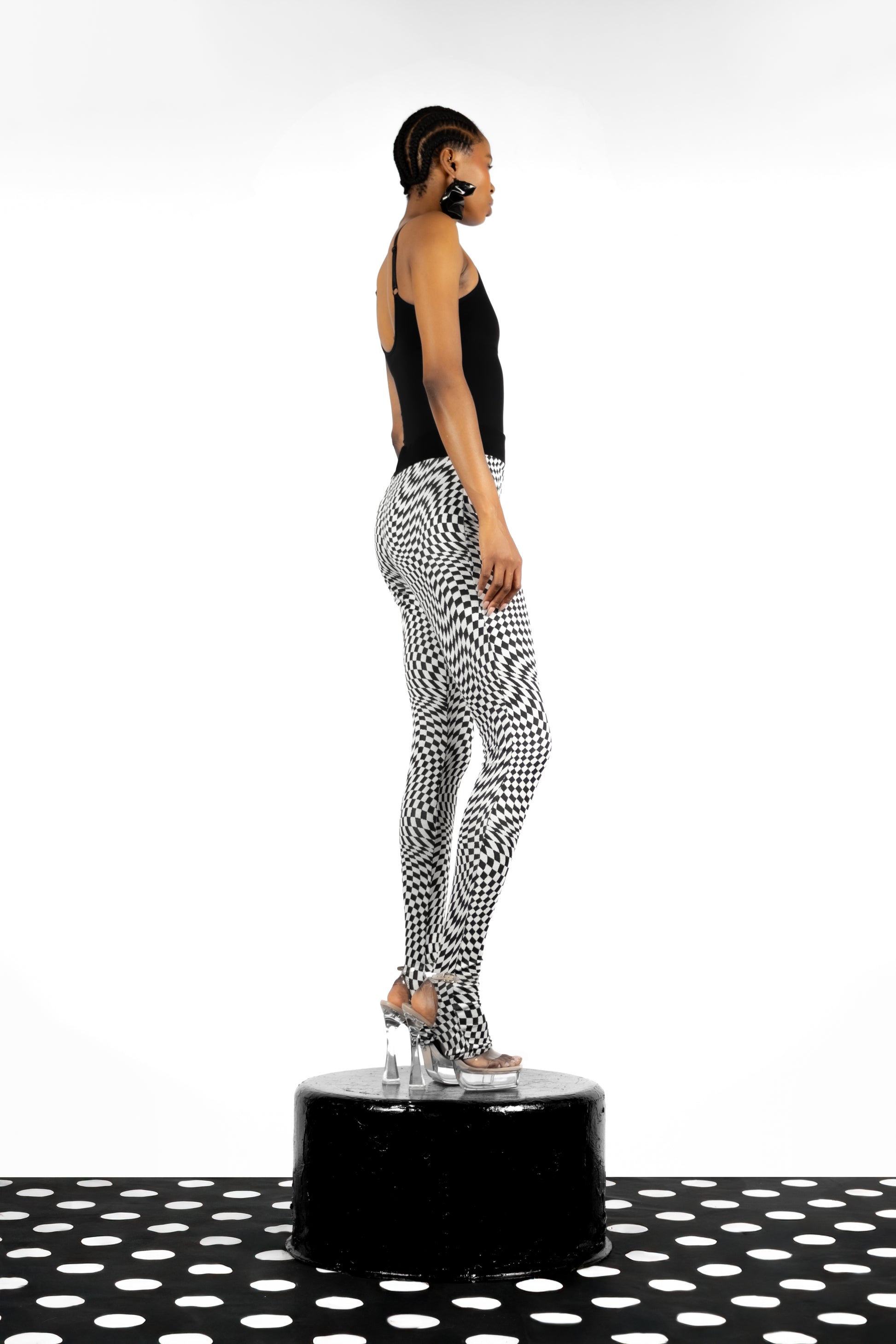 Introducing The Psychedelic Stirrups: A fitted stirrup style legging crafted from a bold optical illusion jacquard knit.