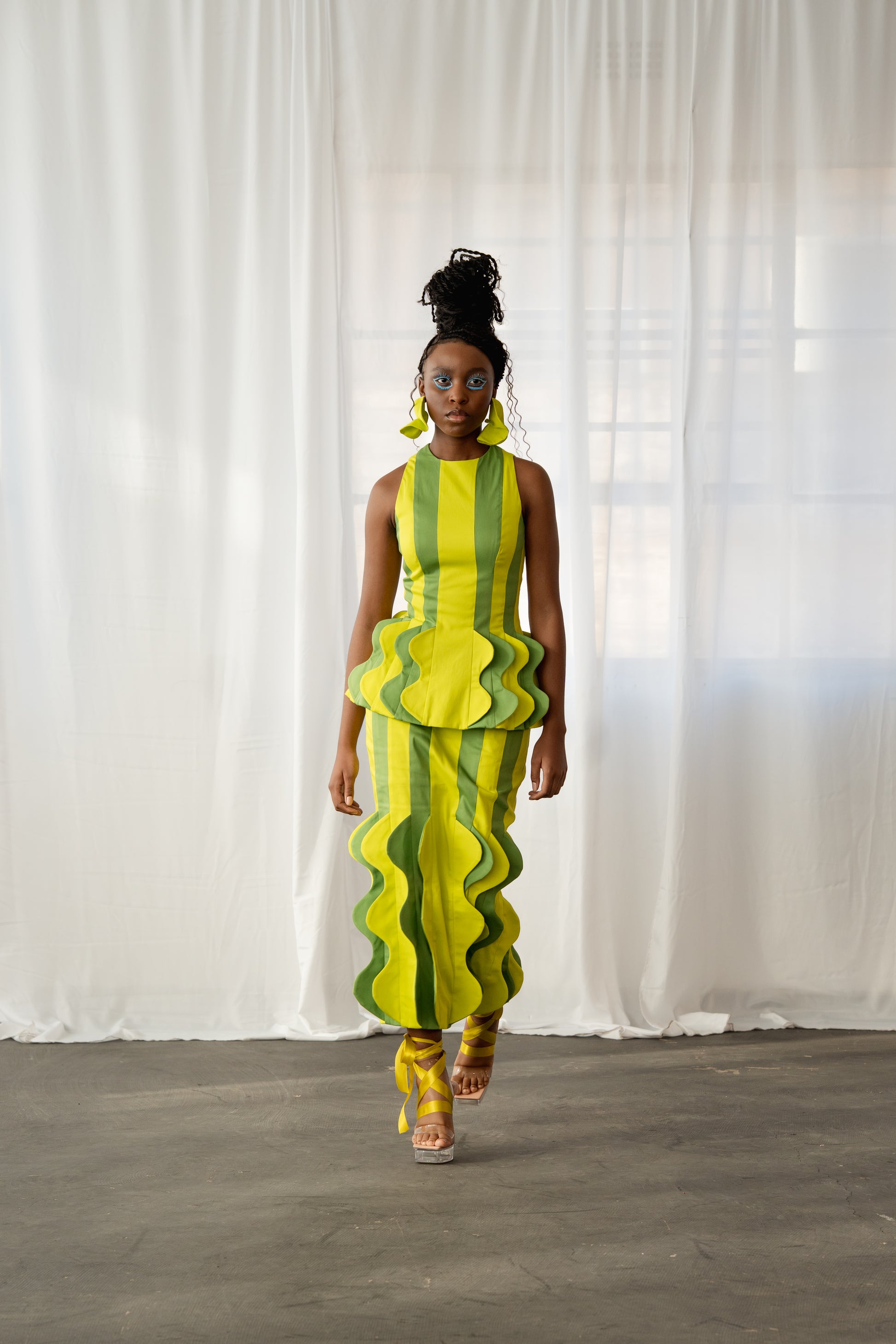 ‘GRAPHISM 25/26’ is not just a collection; it is a manifesto. A vivid exploration of the distinctive iconography, shapes, and motifs that have made BAM a cult name internationally, redefined for the brand’s bold new era. The collection features saturated colours and experimental silhouettes spliced with lacquered fabrics that catch the light like liquid metal, fringe that shimmers with movement, daring chiffons that float with determined ease, and unconventionally draped and sculpted jacquard denim.